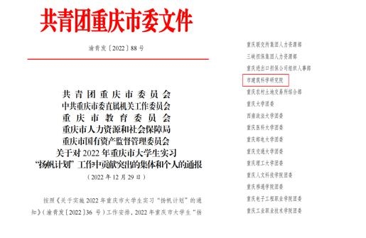 近日,市委直屬機(jī)關(guān)工委、市教委、市人力社保局、市國資委、團(tuán)市委對在 2022 年重慶市大學(xué)生實(shí)習(xí)“揚(yáng)帆計(jì)劃”工作中做出突出貢獻(xiàn)的 97 個組織、 95 名工作者以及表現(xiàn)出色的220 名優(yōu)秀學(xué)生進(jìn)行了通報(bào)。其中,重慶市建筑科學(xué)研究院有限公司(以下簡稱公司)獲得貢獻(xiàn)突出組織稱號,公司黨委辦公室實(shí)習(xí)學(xué)生程慶(重慶交通大學(xué))獲得表現(xiàn)出色個人稱號。