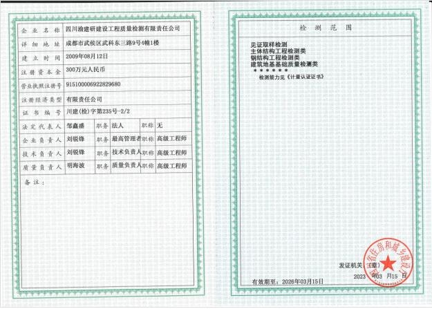 近日,經(jīng)四川省住房和城鄉(xiāng)建設(shè)廳核準(zhǔn),重慶設(shè)計集團市建科院所屬子企業(yè)四川渝建研建設(shè)工程質(zhì)量檢測有限責(zé)任公司(以下簡稱“渝建研”)申請重新核定的建設(shè)工程質(zhì)量檢測機構(gòu)資質(zhì)于2023年3月成功獲批并順利取證。