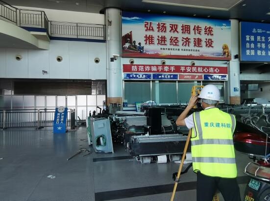 由于時(shí)間緊、任務(wù)重,為保證萬州五橋機(jī)場(chǎng)T1航站樓改造升級(jí)后續(xù)工作順利推進(jìn),市建科院公司接到委托后立即組織在檢測(cè)、鑒定領(lǐng)域具有豐富經(jīng)驗(yàn)的專家及檢測(cè)人員進(jìn)駐現(xiàn)場(chǎng)進(jìn)行檢測(cè)。檢測(cè)人員嚴(yán)格按照相關(guān)規(guī)范的要求,充分考慮現(xiàn)場(chǎng)檢測(cè)的客觀條件,編制了詳盡的檢測(cè)方案,于2023年8月29日開始現(xiàn)場(chǎng)檢測(cè)。在所有檢測(cè)人員的共同努力下,于8月31日如期完成了現(xiàn)場(chǎng)檢測(cè)工作,形成的檢測(cè)、鑒定報(bào)告為后續(xù)改造設(shè)計(jì)提供了依據(jù)。